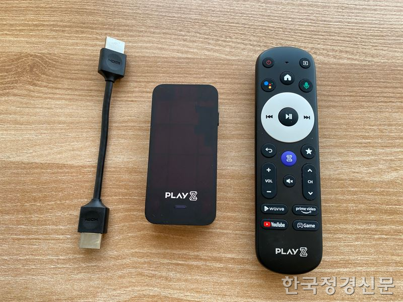 왼쪽부터 플레이제트의 구성품인 HDMI 단자와 본체, 리모콘의 모습. HDMI 케이블이 다소 짧지만 플레이제트 본체와 리모콘은 블루투스 연결이기 때문에 플레이제트 본체가 TV 모니터 뒤로 숨겨져도 리모콘 작동이 부드럽게 잘된다. [자료=송정은 기자]