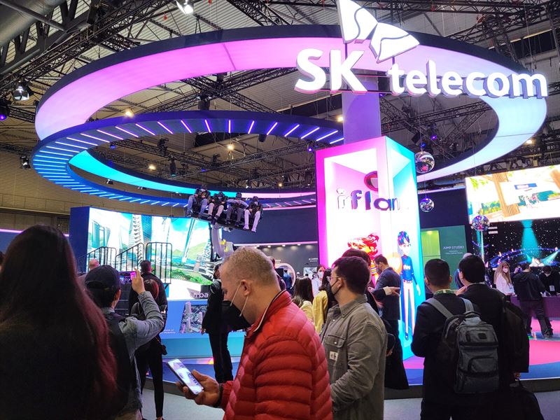 지난달 28일 SK텔레콤이 스페인 바르셀로나에서 개막한 MWC 2022에 전시관을 마련하고 가상현실(VR) 기술 등을 선보이고 있다. [자료=연합뉴스]