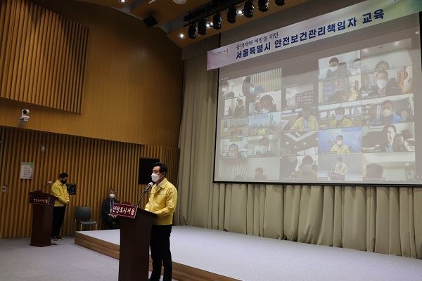 이번 교육대상은 오세훈 서울특별시장을 포함해 25개 자치구청장, 50인 이상 사업 소장과 투자출연기관장 등 안전보건관리책임자 총 123명이다. 코로나19 확산 방지를 위해 10명의 오프라인 참석자는 사전 방역과 마스크 착용 등의 방역 수칙을 철저히 준수했다. 113명의 관리책임자는 실시간 온라인 비대면으로 교육에 참석했다.