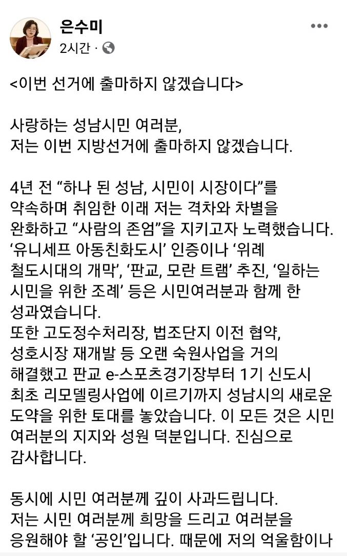 은 시장은 17일 자신의 페이스북에 글을 올려 "저의 억울함이나 참담함과는 별개로 주변관리를 잘 하지 못해 구설수에 오르고 재판을 받는 것은 정말 죄송한 일"이라며 "몰랐다는 사실 자체도 송구할 따름이다. 불출마를 통해 온전히 책임을 지겠다"며 이처럼 밝혔다.