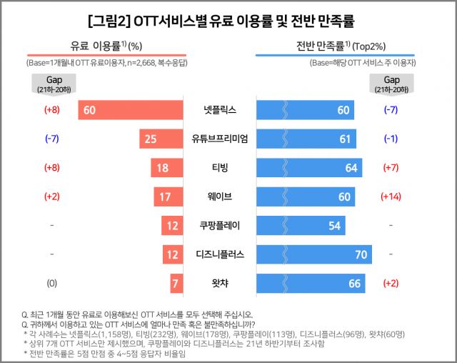 유료이용률 문항에 응답한 인원을 대상으로 조사한 전반 만족률에서 티빙은 64%의 만족도를 보이며 디즈니플러스(70%), 왓챠(66%)에 이어 3위를 차지했다. 티빙의 뒤는 유튜브 프리미엄(61%), 넷플릭스·웨이브(60%)가 이었다.