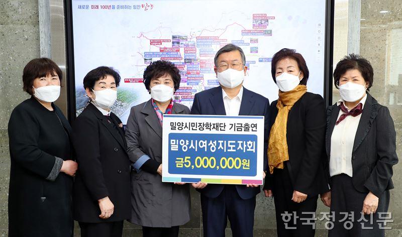 [한국정경신문(밀양)=최규철 기자] (재)밀양시민장학재단(이사장 박일호)은 28일 밀양시여성지도자회(회장 이태순)와 지역 인재양성 및 명문학교 육성지원을 위한 장학기금 500만원을 전달하는 기탁식을 가졌다고 밝혔다.