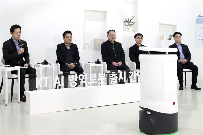 30일 오전 KT AI 로봇사업단 이상호 단장(왼쪽 두번째)를 비롯한 KT AI로봇사업단 임원들이 'AI 방역로봇' 출시 기자설명회에 참석하고 있다. [자료=KT]