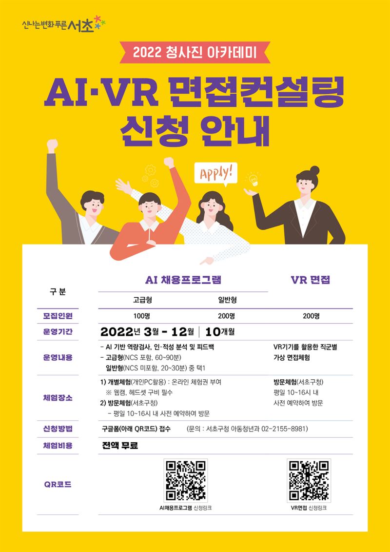 'AI/VR 면접컨설팅'은 사전예약제로 운영된다. 평일 오전 10시부터 오후 4시까지 희망하는 시간을 선택 후 서초구청 8층 교육실을 방문해 체험할 수 있다. 이 중 'AI 채용프로그램'의 경우 웹캠이 있는 개인PC와 헤드셋만 있다면 가정에서도 체험이 가능하다.
