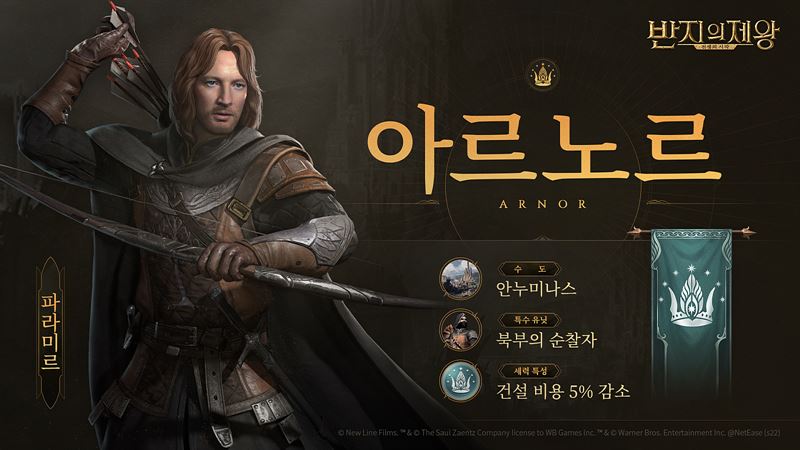 중간계 북쪽에 자리한 두네다인 왕국 '아르노르'를 선택하면 안누미나스에서 영웅 '파라미르'로 시작하게 된다. 아르노르는 '건설 비용 5% 감소' 특성이 있어 누구보다 저렴하게 내 세력을 확장할 수 있다. 또한 특수 유닛 '북부의 순찰자'를 통해 다른 세력의 정보를 빠르게 알아낼 수 있다.