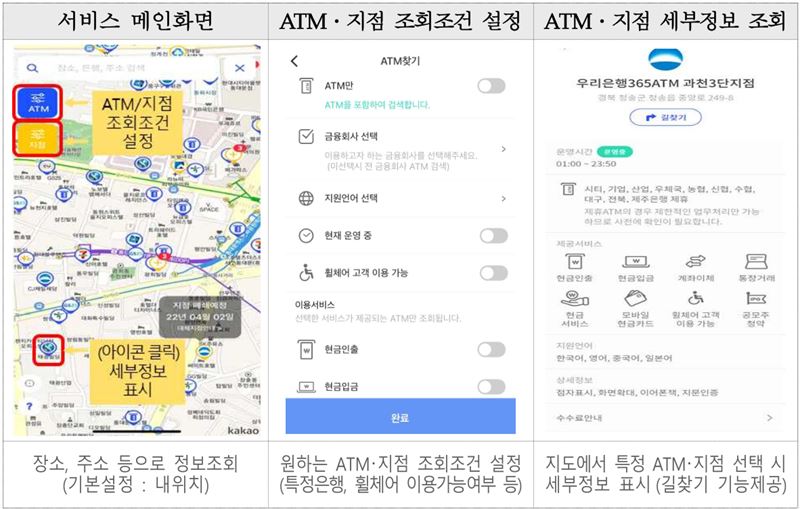 위치, 운영시간 등 기본 정보 외에도 수수료, 폐쇄예정정보 및 대체 지점 등 개별 ATM·지점에 대한 세부정보도 함께 제공한다.