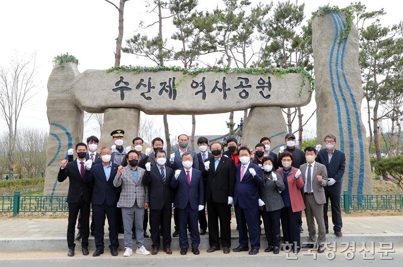 [한국정경신문(밀양)=최규철 기자] 밀양시는 14일 하남읍 수산리에 위치한 수산제 역사공원에서 상징 조형물 제막식 및 홍보관 개관식을 개최했다.