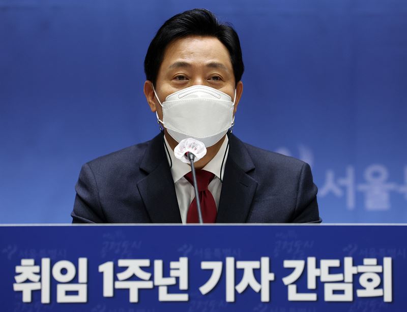 17일 리얼미터가 조사한 6.1 지방선거 후보적합도 설문조사에서 오세훈 서울시장이 더불어민주당의 서울시장 주요 후보군인 이낙연 전 대표와 송영길 전 대표를 크게 앞서는 것으로 나타났다. 사진은 지난 12일 취임 1주년 간담회에 참석한 오세훈 서울 시장 [자료=연합뉴스]