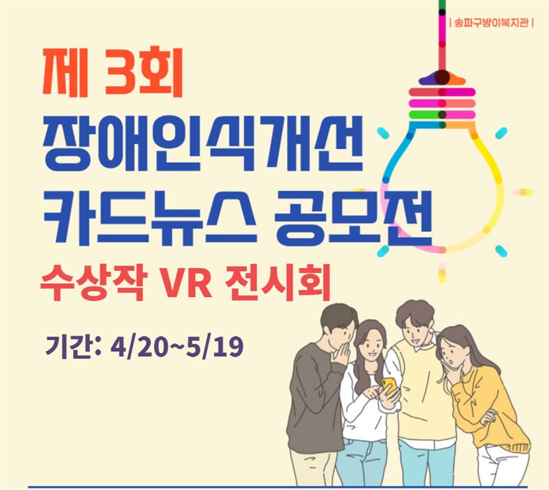18일 송파구방이복지관은 오는 20일부터 5월19일까지 '제42회 장애인의 날'을 기념해 '제3회 장애인식개선 카드뉴스 공모전' 수상작을 모아 VR 전시회를 개최한다고 밝혔다. [자료=송파방이복지관]