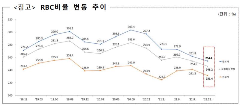 26일 보험업계에 따르면 올해 1분기 실적을 공시한 보험사들의 지급여력(RBC) 비율은 전분기보다 17.1~67.1%포인트 낮아졌다. 자료는 지난해 12월 말 기준 RBC 비율 변동 추이 [자료=금융감독원]