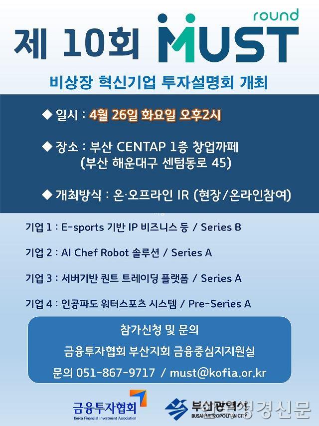 이번 ‘제10회 머스트 라운드(MUST Round)’에서는 부산테크노파크, 부산창조경제혁신센터, 부산경제진흥원, 부산디자인진흥원, 부산정보산업진흥원으로 구성된 기업선정협의회의 심사를 통해 선정된 혁신기술기업 4개 사가 투자유치에 나선다.