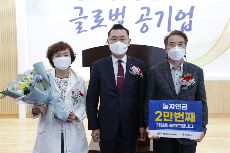 농지연금 2만번째 가입자(오른쪽)는 경기도 가평에사는 64세 김광식씨로 전후후박형 상품에 가입했다. 사진 가운데 강경학 농지관리이사 가입자 배우자 순. [자료=한국농어촌공사]