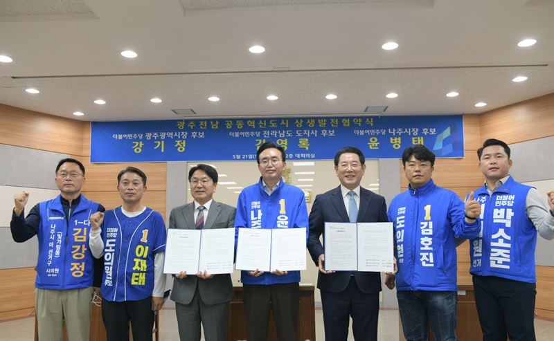 김영록 더불어민주당 전라남도지사 후보는 21일 나주 남평농협 대회의실에서 민주당 강기정 광주광역시장 후보, 윤병태 나주시장 후보와 ‘전남·광주·빛가람혁신도시 상생정책협약’을 맺고 상생발전을 위한 공동협력을 약속했다. [자료=후보선거사무소]
