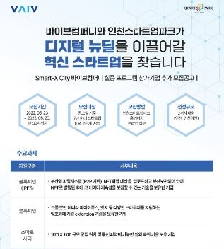 [한국정경신문(인천)=김양훈 기자] 인천경제자유구역청과 바이브컴퍼니가 스마트시티 및 블록체인 분야 혁신 스타트업을 지원하는 ‘Smart-X City(바이브컴퍼니) 프로그램’에 참여할 스타트업을 내달 20일까지 추가 모집한다고 31일 밝혔다.