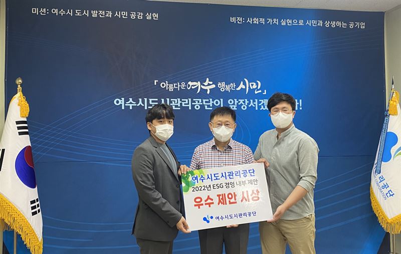 [한국정경신문(여수)=최창윤 기자] 여수시도시관리공단(이사장 김태규)은 주민과 내부직원의 경영 참여와 혁신적이고 실현 가능한 ESG경영 과제를 발굴하고자 실시한 ‘2022년 ESG경영 내부 제안 및 주민참여 아이디어 공모전’에서 우수 아이디어를 각각 2건씩 선정 시상식을 개최했다고 7일 밝혔다.