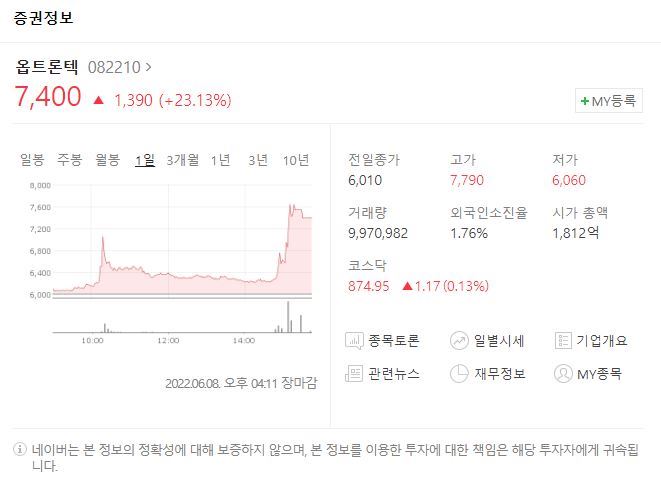 8일 한국거래소에 따르면 옵트론텍 주가는 7400원에 거래를 마쳤다. 이는 전 거래일 대비 23.13%(1390원) 오른 값이다.