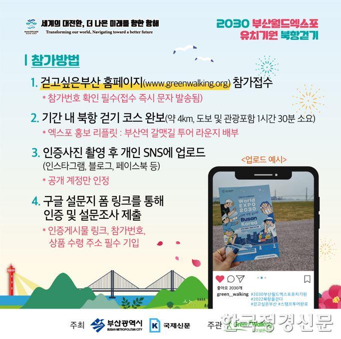 참가 방법은 먼저, 걷고싶은부산 누리집에서 신청 후 참가번호가 적힌 문자를 확인한다. 행사기간 내 걷기코스를 완보하고 인증사진을 개인 누리소통망(SNS)에 올리면 된다. 이후 구글 설문지 폼 링크를 통해 인증게시물 링크주소, 참가번호, 상품 수령 주소를 기입하면 된다.