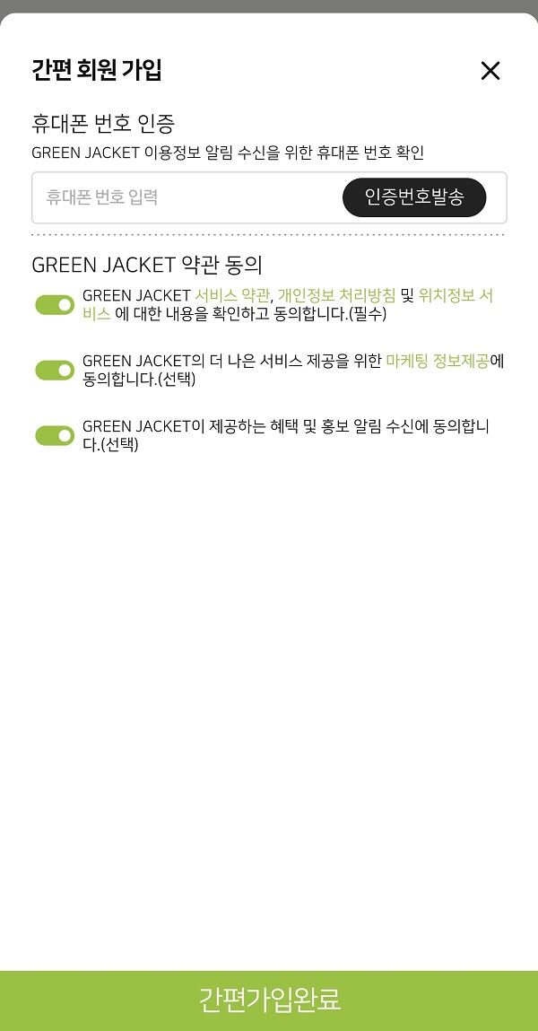 '그린재킷' 앱 회원 가입 초기 화면 [자료=한국정경신문]