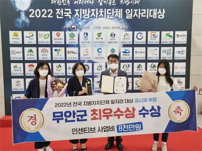 [한국정경신문(무안)=최창윤 기자] 무안군(군수 김산)은 지난 21일 세종 컨벤션센터에서 열린 고용노동부 주관 2022년 전국 지방자치단체 일자리대상 시상식에서 일자리 공시제 부문 최우수상을 수상했다고 밝혔다.