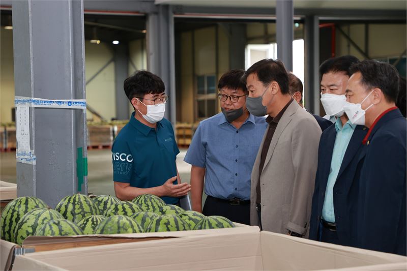 22일에는 첫 출하를 기념해 전춘성 진안군수가 진안군 산지유통센터 수박선별장을 방문해 수박 출하 현장을 둘러보고 관계자들을 격려했다. [자료=진안군]