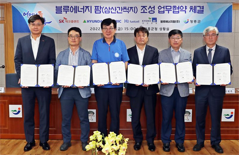 22일 열린 협약식에는 SK에코플랜트 이왕재 BU대표, 현대일렉트릭 박상훈 BU대표, 교보악사 오주석 BU대표, 하이퓨얼셀 이형영 대표, 블루에너지팜 신현주 대표가 참석했다고 25일 밝혔다. [자료=장흥군]
