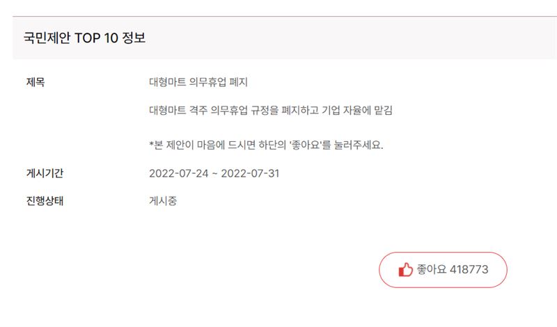 10대 국민제안에서 대형마트 의무휴업 폐지는 ‘좋아요’ 41만 여건을 받아 현재 국민 호응 1위를 기록하고 있다. [자료=국민제안 홈페이지]