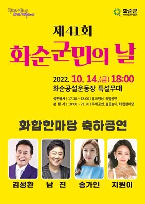 화순군(군수 구복규)은 오는 14일 화순공설운동장 특설무대에서 펼쳐지는 제41회 화순군민의 날 행사 무대를 군민에게 큰 즐거움을 주는 공연으로 준비했다고 밝혔다.