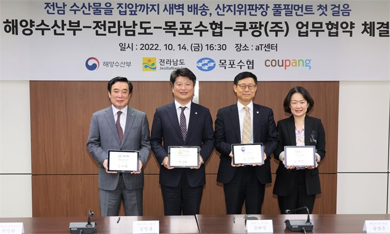 이날 협약에는 박창환 전남도 정무부지사, 송창근 해양수산부 차관, 윤혜영 쿠팡 리테일 부사장, 김청룡 목포수협 조합장 등이 참석했다.