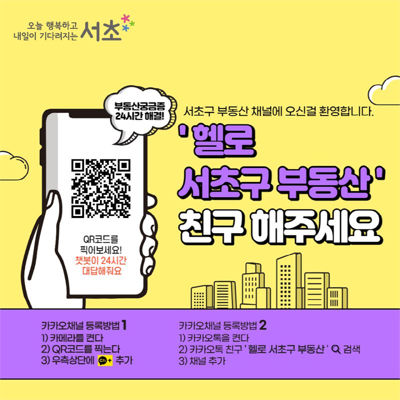 카카오톡 QR코드 스캔을 해서 채널 추가를 하거나 카카오톡 채널 검색창에 ‘헬로 서초구 부동산’이라고 검색해 이용할 수 있다.