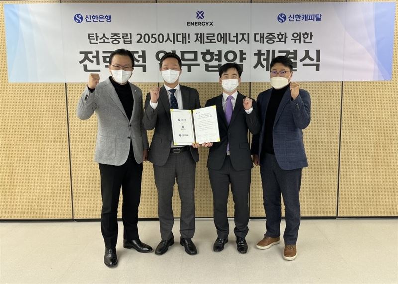 [한국정경신문=윤성균 기자] 신한은행(은행장 진옥동)은 ESG 경영을 실천하고 탄소중립 대중화를 촉진하고자 제로에너지빌딩(ZEB, Zero Energy Building) 건축 플랫폼인 에너지엑스(ENERGYX)와 전략적 업무협약을 체결했다고 21일 밝혔다.