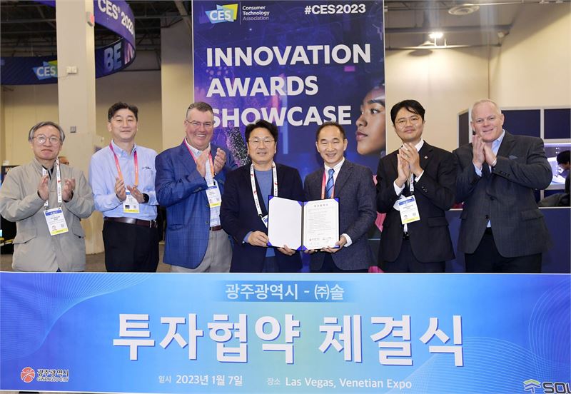 협약식은 7일(현지시간) 강기정 시장, 이종묵 ㈜솔 대표이사 등이 참석한 가운데 미국 라스베이거스 CES 2023 혁신상 수상 기업관 앞에서 열렸다.