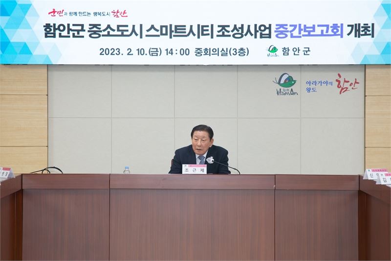 함안군은 10일 오후 군청 3층 중회의실에서 조근제 함안군수 및 관련부서 공무원이 참석한 가운데 ‘함안군 중소도시 스마트시티 조성사업’ 중간보고회 개최했다. [자료=함안군]
