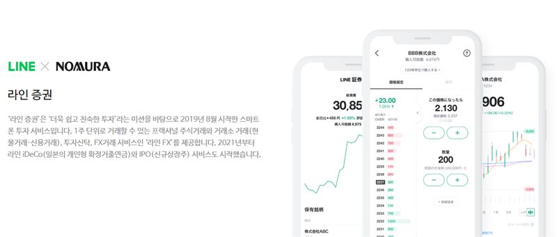 라인증권은 라인파이낸셜이 51%, 노무라홀딩스가 49%를 출자해 2019년 설립됐다. 라인 메신저를 기반으로 하는 투자 서비스 플랫폼으로 지난해 기준 150만 계좌를 보유하고 있다.