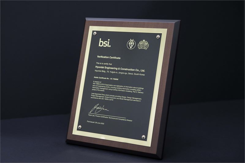 건설사들이 정부가 건설 현장 BIM 의무 도입을 추진하는 상황에서 실제 현장 활용과 국제표준인증을 받으며 관련 기술 도입·확대에 분주한 모습을 보인다. 사진은 ISO 19650 인증서. (자료=현대건설)