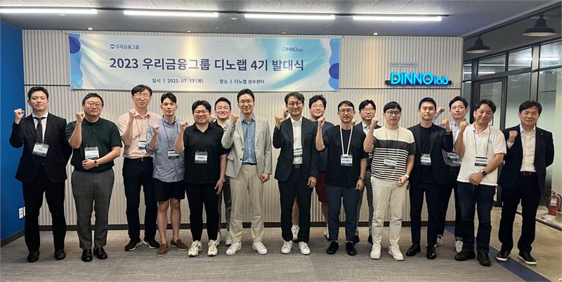 17일 우리금융그룹 최고디지털책임자 옥일진 전무, 디지털혁신부 고영수 본부장, 디노랩 4기 14개사 스타트업 대표들이 디노랩 4기 발대식에 참여해 기념촬영을 하고 있다. (자료=우리금융그룹)