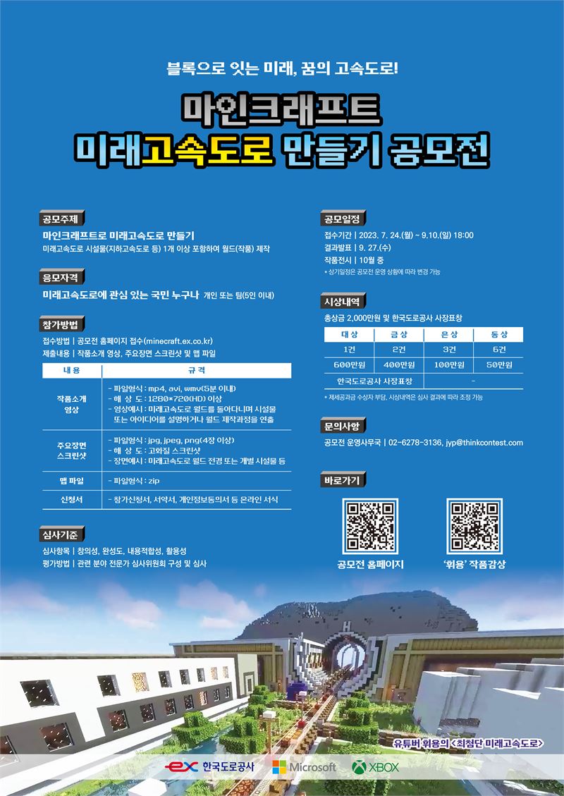 한국도로공사는 게임운영사 마이크로소프트·Xbox와 함께 ‘마인크래프트 미래고속도로 만들기 공모전’을 개최한다고 24일 밝혔다.
