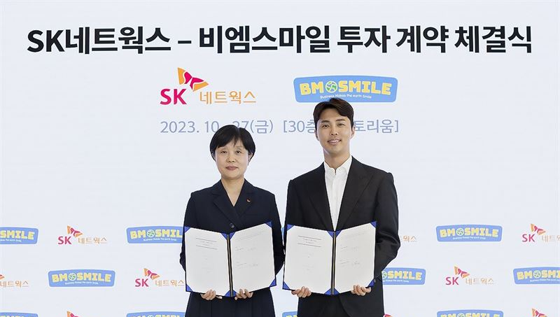 류성희 SK네트웍스 지속경영본부장(왼쪽)과 박봉수 비엠스마일 대표가 지난 27일 열린 투자 기념행사에서 기념 촬영하고 있다. (자료=SK네트웍스)