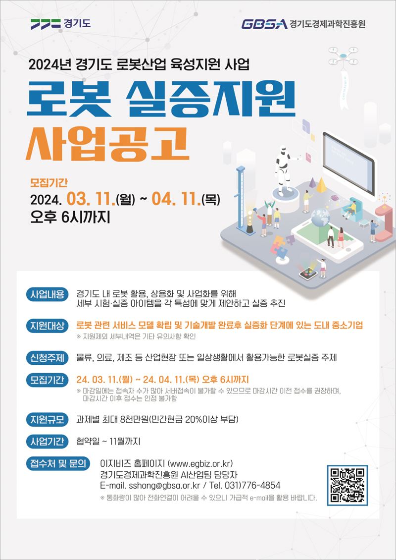 도는 올해 실증 지원 프로그램 외에도 전시회 참가 지원 등 로봇산업 활성화를 위한 다양한 사업을 추진할 계획이다. 자세한 사항은 이지비즈 누리집을 통해 공고문을 확인하거나, 경기도경제과학진흥원 AI산업팀으로 문의하면 된다.