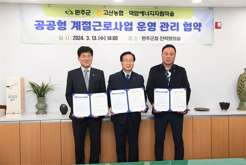 13일 완주군은 몽골 날라이흐구 공공형 계절근로자 30명이 5개월간 지내게 될 공동숙소의 효율적 운영관리를 위해 고산농협, 덕암에너지자립마을 영농조합법인과 손을 맞잡았다.