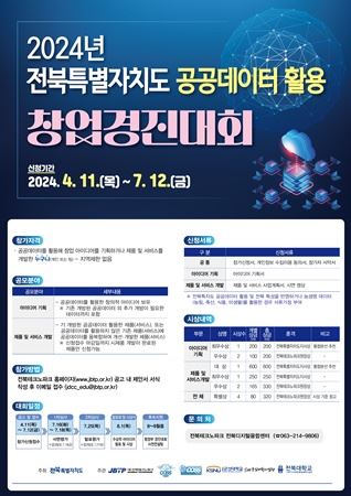 [한국정경신문(전주)=최창윤 기자] (재)전북테크노파크(원장 이규택)가 2024년 전북특별자치도 공공데이터 활용 창업 경진대회 참가자를 모집한다고 11일 밝혔다.