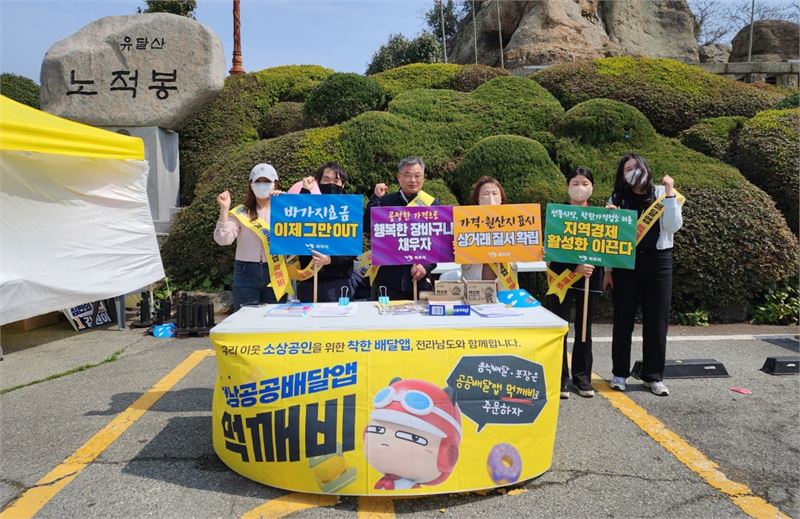 목포시가 지난 3일 5월 가정의 달 및 전국소년(장애학생)체전 기간을 맞이해 전남도 민간 협력형 공공 배달앱인 ‘먹깨비’ 할인이벤트를 진행한다고 밝혔다. 유달산 노적봉에서 ‘먹깨비’ 이용 활성화를 위해 홍보캠페인을 실시했다. (자료=목포시)