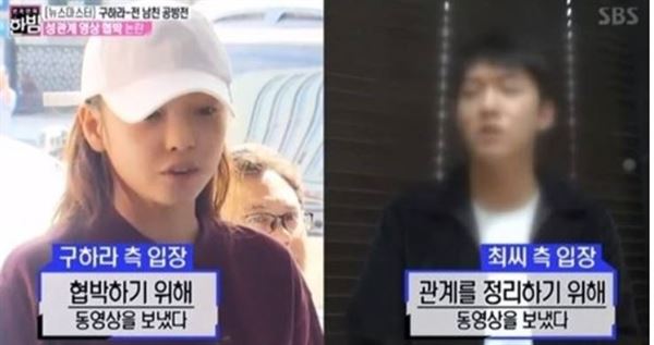 구하라는 전 남친 최 씨가 다툼 이후 “연예인 인생 끝나게 해주겠다”는 말과 함께 언론에 제보하겠다는 통보를 들은 뒤, 30초 분량의 사생활을 침해하는 동영상 파일을 받았다고 주장했다.