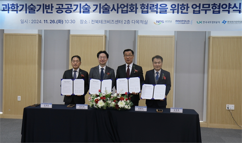 [한국정경신문(전주)=최창윤 기자] 한국전기안전공사(사장 남화영)는 26일 오전 전북 전주시 전북테크비즈센터에서 연구개발특구진흥재단, 국민연금공단, 한국국토정보공사와 ‘공공기술 사업화 협력을 위한 업무협약’을 체결했다고 27일 밝혔다.