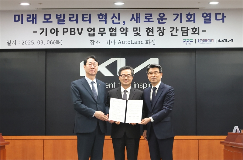 경기도가 기아 2조 2000억 원 규모 투자유치에 성공했다고 6일 밝혔다. 김동연 경기도지사는 이날 오토랜드 화성에서 정명근 화성시장, 송호성 기아 사장과 이 같은 내용의 ‘PBV 기반 미래 모빌리티 생태계 조성을 위한 투자협약’을 체결했다. (자료=경기도)