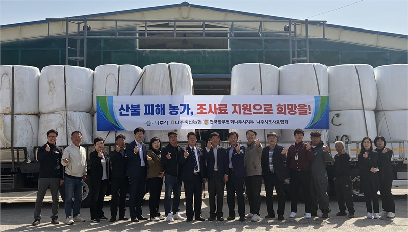 [한국정경신문(나주)=최창윤 기자] 전라남도 나주시 축산단체들이 경북지역 산불 피해 축산농가에 가축 먹이인 조사료를 지원하고 나섰다. 이달초 3000만원 상당 식품(누룽지·김) 지원에 이은 구호 활동으로 이재민들에게 희망의 손길을 전했다.