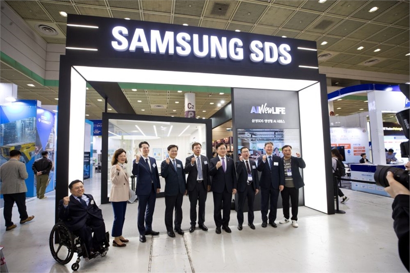 유상임 과학기술정보통신부 장관이 24일 서울 강남구 코엑스에서 열린 2025 월드IT쇼 '삼성SDS' 전시관에서 관계자들과 기념 촬영하고 있다. (자료=과학기술정보통신부)