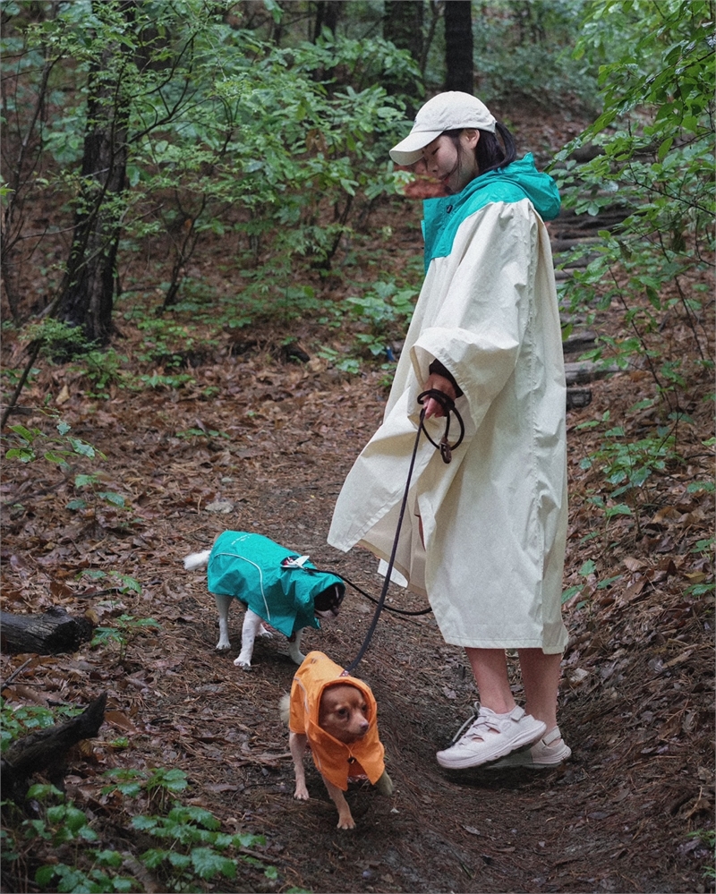 ‘아이더 펫 레인코트’는 등판 하네스 통과 홀이 적용되어 착용 편의성을 높였고, 하단 벨크로 조임 방식으로 반려견 체형에 맞춰 조절할 수 있어 활동 중에도 안정적인 핏을 유지해 준다.