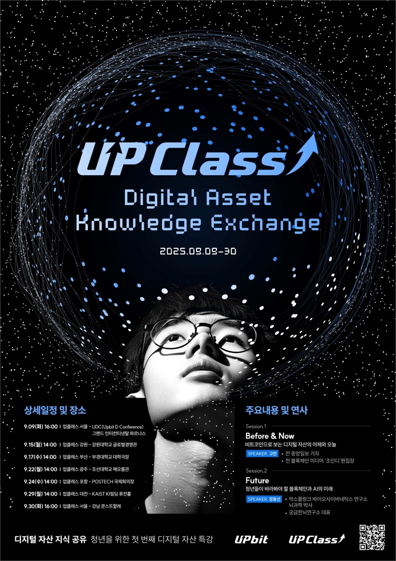 업비트는 올해 하반기 교육 대상을 시니어에서 청년으로 확장해 2030 대상 업클래스를 진행한다. 9월 9일 서울에서 열리는 ‘업비트 D 컨퍼런스 2025’에서 시작해 카이스트·포스텍·강원대·부경대·조선대 등 전국 5개 대학교를 순회한다. 이후 서울 강남구 SJ쿤스트할레에서 여정을 마무리할 예정이다. 참가비는 모두 무료다.