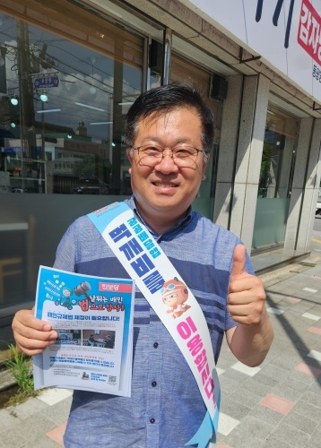 19일 오후 전남 광양시 중마동 오류공원 인근 상가 밀집지역에서 백성호 광양시의원은 구석 구석을 돌며 먹깨비 홍보를 위해 구슬땀을 흘렸다. (사진=최창윤 기자)