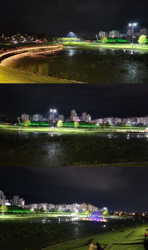 순천시와 순천시 세계유산보존협의회는 12일 오후 그린아일랜드에서 2025 세계유산축전 선암사, 순천갯벌 개막식을 개최했다고 밝혔다. 오천그린광장 야경모습 (사진=최창윤 기자)